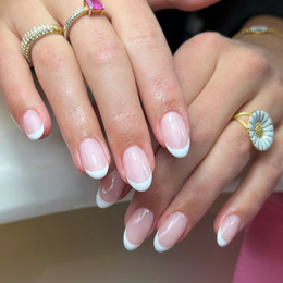 Fransk kant – den klassiske hvide streg på neglespidsen. Kan også laves i andre farver end hvid.